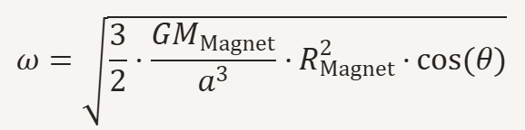 ω = √[(3/2) · (μ₀ · m₁ · m₂) / (M · r³) · cos(θ)]