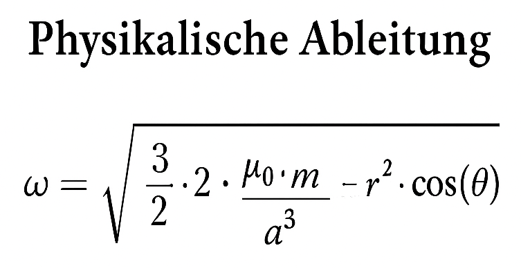 „Die kontaktlose Rotation des freien Magneten entsteht durch ein asymmetrisches magnetisches Drehmoment, das ihn in eine anziehende Orientierung kippen möchte. Da sein Eigengewicht eine vertikale Neigung verhindert, entlädt sich das Moment in eine horizontale Rotation. Die magnetische Formel beschreibt die Ursache der Drehbewegung, die gravitative Formel deren kanalisierten Verlauf. Beide sind notwendig, um das Prinzip der feldinduzierten, kontaktlosen Eigenrotation unter mechanischer Einschränkung vollständig zu erfassen.“