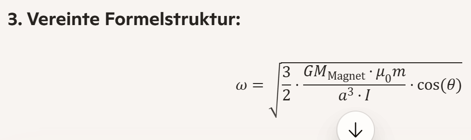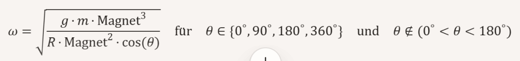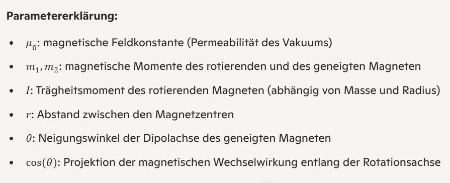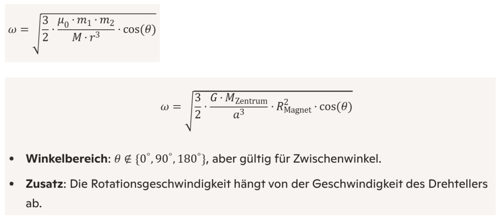 Ohne Drehteller: Wenn der geneigte Magnet in der Hand auf den stehenden Magneten auf der Tischfläche zubewegt wird, beschreibt die folgende Formel die Winkelgeschwindigkeit ((\omega)) des Magneten: [ \omega = \sqrt{\frac{3}{2} \frac{G M_{\text{Magnet}}}{a³} R_{\text{Magnet}}² \cos(\theta)} \quad \text{für} \quad \theta \notin {0^\circ, 90^\circ, 180^\circ} \quad \text{und} \quad (0^\circ < \theta < 90^\circ \quad \text{oder} \quad 90^\circ < \theta < 180^\circ) ] Die Schwerkraft spielt eine wichtige Rolle, da sie die Rotation aufrechterhält. Die Drehgeschwindigkeit hängt hauptsächlich von der Geschwindigkeit des Drauf-zu-Bewegens ab.