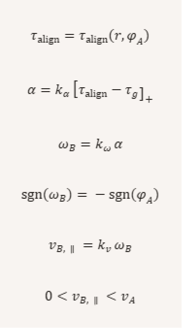 Damit A B kontinuierlich in der ungünstigen Lage halten und den Ausrichtungsversuch immer wieder neu anregen kann, muss A sich stets ein kleines Stück schneller bewegen als B. Nur so bleibt die radiale Abstoßwirkung erhalten und die Rotation sowie die daraus resultierende Bahnbewegung werden aufrechterhalten: