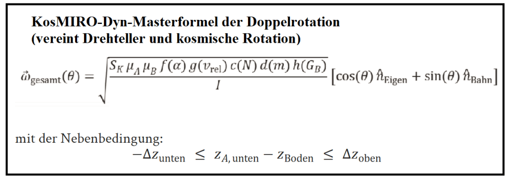Die Formel beschreibt die Überlagerung zweier Rotationsanteile: der Eigenrotation des B‑Magneten und der Bahnrotation um eine seitlich versetzte Achse. Die Achsneigung bestimmt die Gewichtung beider Anteile. Die Faktoren und repräsentieren systemabhängige Größen wie magnetische Momente, Relativgeschwindigkeit, Neigungswinkel und geometrische Führung. Der neue Faktor beschreibt den Einfluss des Eigengewichts des B‑Magneten auf die Umlenkung seiner blockierten vertikalen Drehneigung in die horizontale Rotation. Das Trägheitsmoment bestimmt die resultierende Rotationsstärke. Die Nebenbedingung begrenzt die vertikale Lage des A‑Magneten relativ zur Unterlage und definiert damit den zulässigen Bereich der Achsneigung.