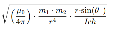 Dabei beschreibt ω die Winkelgeschwindigkeit, μ₀ die magnetische Feldkonstante, m₁ und m₂ die magnetischen Momente zweier Dipole, r den Abstand zwischen ihnen, θ den Neigungswinkel der Dipolachse und I das Trägheitsmoment des rotierenden Körpers.