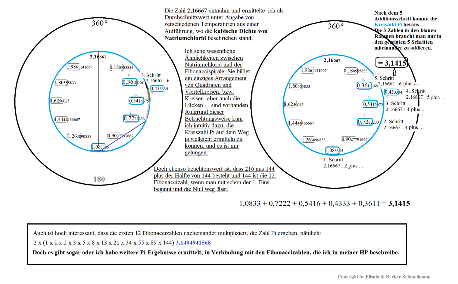Dankeschön! Es steht nun genauso da! Ich zeige dir, was ich auf meiner Seite https://verliebt-in-Mathematik.de.tl gefunden habe. Es ist schon Jahre her, wo mir dies und jenes intuitiv in den Sinn kam, so dass ich mich manchmal erst wieder daran erinnere, wenn ich auf die Seite nachschauen gehe. Siehe hier den Ausschnitt: “Ich möchte anschließend hier, aber auch auf weiteren Seiten näher beschrieben, besonders ein weiteres von mir vorgestelltes System oder vor allem das, was es zu entdecken gab, bestimmt mit Recht als phänomenal nennen dürfen. Denn bemerkenswert in diesem Zusammenhang ist u.a. die Verwandtschaft zwischen der 12. Fibonaccizahl 144 und der Zahlenfolge 216, denn sie ist zunächst schon einmal die der 144 zu-addierte Hälfte. Ich bin ein wenig stolz im Sinne von glücklich und dankbar, jene Verbindungen zwischen Pi und Fibonacci oder zwischen Fibonacci und Phi entdeckt haben zu dürfen. Ferner im Zusammenhang mit der Zahl der kubischen Dichte von Natriumchlorid, 2,16… Jedenfalls schlage ich ab heute vor, in den Lehrbüchern künftig jene gleich näher von mir dargelegte Verwandtschaften zwischen Pi und Fibonacci/und Phi und darüber hinaus jene nachher noch beschriebene Verbindung zu der Dichte-Zahl von Natriumchlorid zu lehren, die Lehrbücher also ein klein wenig umzuschreiben oder zu erweitern. Modern ausgedrückt, ihnen ein neues Update zu verpassen. Ich zeige dabei unter anderem auf, wie ich in wenigen Schritten, nämlich in 6 grundsätzlichen Rechenschritten, mithilfe jener gleichen Zahl, die auch für die kubische Dichte von Natriumchlorid ermittelt steht, ebenfalls zu der Kreiszahl Pi komme mit erstaunlicher Nähe zu den Zahlen hinter dem Komma unseres bekannten Pi, nämlich zu zumindest 3,1415… Denken Sie in dem Zusammenhang — sofern Sie mit dem Thema vertraut sind — vielleicht auch an jene Ähnlichkeiten, wie sie zwischen dem Aufbau von Natriumchlorid und der Fibonaccispirale bestehen! In beiden System spielen Quadrate und Kreise (bei 2D) sowie Würfel und Kugeln (bei 3D) eine m.E. wesentliche Rolle zusammen mit der dichtesten Kugelpackung (auf das Salz bezogen oder mit der dichtesten Kreise-Anordnung in der Fibonacci-Spirale. Auch die bei der Fibonacci-Spirale jeweilige Verdoppelung im jeweils nächsten Schritt sowohl der Summe der beiden vorigen Quadrate als auch sich entsprechend im jeweils nächsten Kreisradius auswirkend. UND bezüglich der Kreise im Verhältnis zu den beim Natriumchlorid vorliegenden doppelt-großen Kugeln gegenüber den kleineren ist erstaunlich. Ebenso die Art der regelmäßigen Lückenentstehung. Das Anwachsen der Fibonaccispirale dürfte auch ähnlich sein zum “Anwachsen” der Salzmoleküle. So komme ich in nur 6 grundlegenden Schritten über die Zahl 2,16 (siehe: die Zahlenfolgeverbindung zwischen 144 (als die 12. Fibonaccisequenz) und 216; 144 mal 1,5 = 216) bzw. über die (Temperatur-spezifisch gemittelte) Zahl der Dichte von Salz, nämlich 2,16667 zu Pi, wie folgt: …” (Dann folgt eine Grafik.)